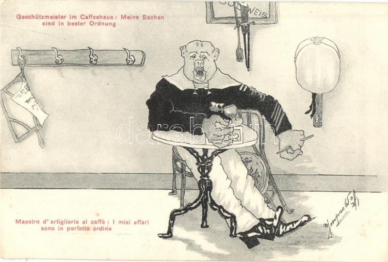 Geschützmeister im Caffeehaus: Meine Sachen sind in bester Ordnung / K.u.K. Kriegsmarine mariner humorous art postcard. G. Costalunga 25091. s: Joseppo Wolf (?)