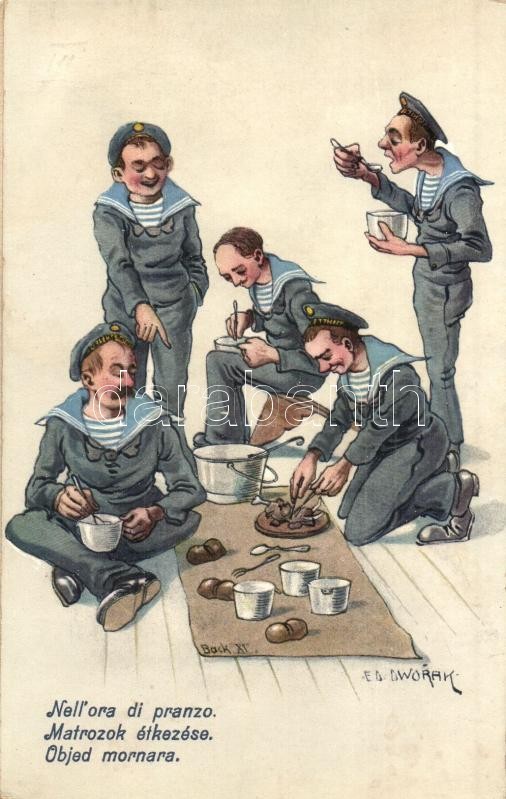 Matrózok étkezése / Objed mornara / Nell'ora di pranzo / K.u.K. K... https://www.darabanth.com/hu/327-Gyorsarveres/327.0/Kepeslapok/Hadihajo~1000057/Matrozok-etkezese-Objed-mornara-Nellora-di-pranzo-KuK-Kriegsmarine-mariner-humour-art-p~II1821415