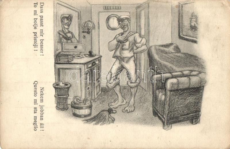 Nekem jobban áll! / Dass passt mir besser! / To mi bolje pristoji! / Questo mi sta meglio / K.u.K. Kriegsmarine mariner humour art postcard. C. Fano 1917. 2005. unsigned Ed. Dworak (EK)