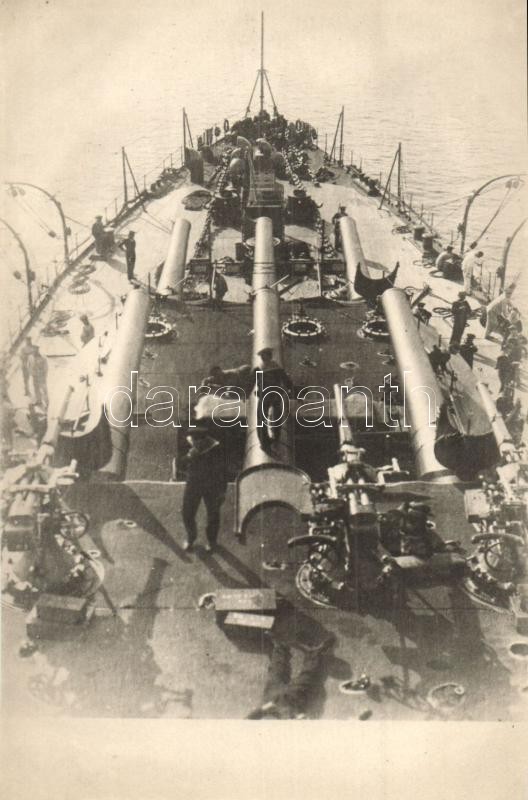 SMS Prinz Eugen Osztrák-Magyar Haditengerészet Tegetthoff-osztályú csatahajója, első két torony 3-3 löveggel / K.u.K. Kriegsmarine SMS Prinz Eugen dreadnought battleship's deck, mariners and cannons. photo
