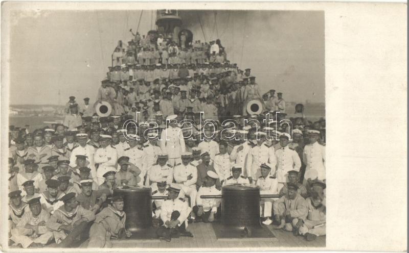 SMS Prinz Eugen Osztrák-Magyar Haditengerészet Tegetthoff-osztályú csatahajóján felolvassák az olaszok hadba lépésének nyilatkozatát, kapitány, tisztek / Verlesung der ital. Kriegserklärung auf SMS Prinz Eugen / WWI K.u.K. Kriegsmarine mariners listening to the Italian declaration of war on SMS Prinz Eugen dreadnought battleship, captain, naval officers. Rotes Kreuz Atelier 1916.