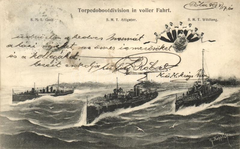 Leírás: Torpedobootdivision in voller Fahrt / SMS Greif, SMS Alligator, I. osztályú torpedónaszádok, SMS Wildfang Huszár-típusú torpedóromboló (Zerstörer), matrózok / WWI K.u.K. Kriegsmarine destroyers, torpedoboat, mariners. G. Fano Pola 1908 s: G. Kappler