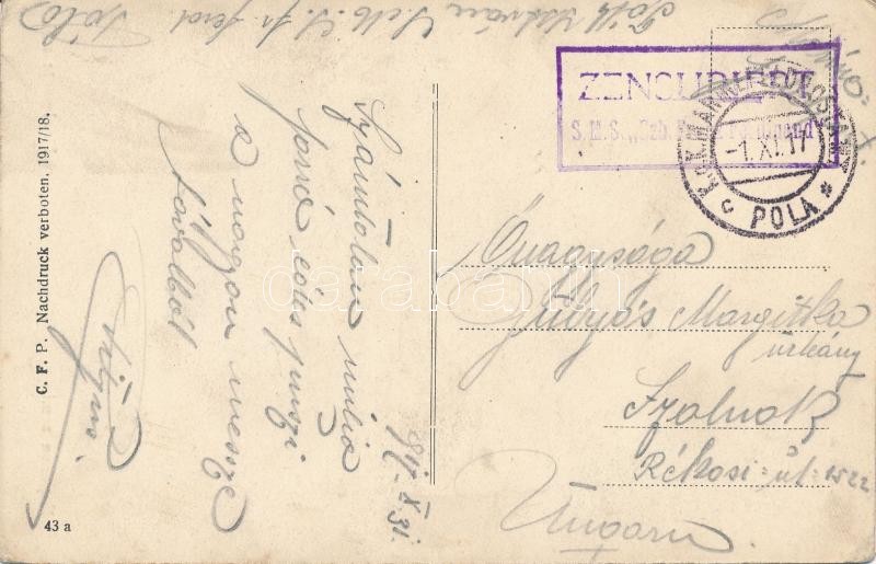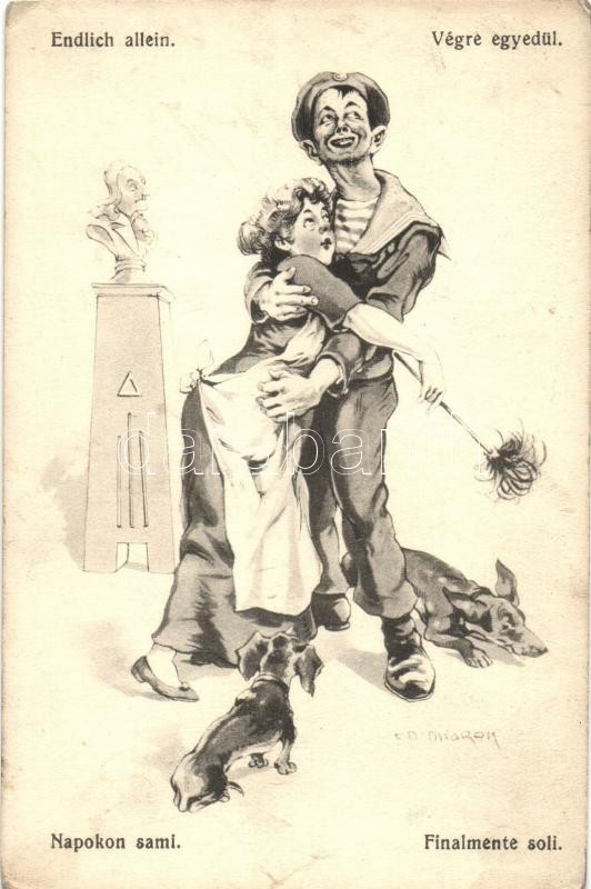 Végre egyedül / Endlich allein / Finalmente soli / Napokon sami / K.u.K. Kriegsmarine mariner humour art postcard. C.F.P. 1917/18. 43a. + SMS Ezh. Franz Ferdinand s: Ed. Dworak