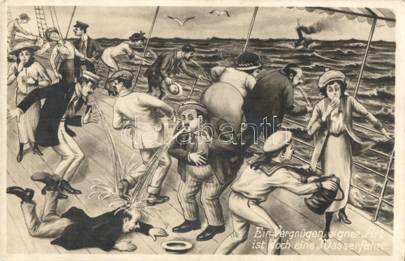 Leírás: Ein Vergnügen, eigner Art ist doch eine Wasserfahrt / seasickness on board of a ship. Kunstverlag I. Wollstein Nr. 2106.