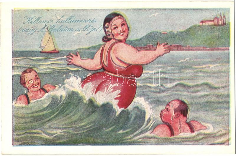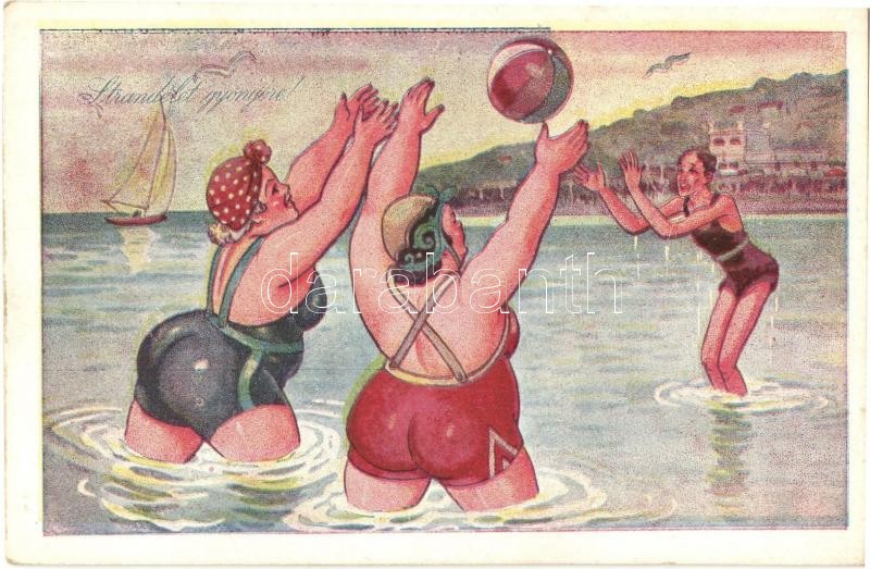 "Kellemes hullámverés" "Strandélet gyönyöre" "Az árnyékot is jól kell megválasztani" 3 db RÉGI használatlan humoros képeslap / Fat lady at the beach 3 pre-1945 unused postcards