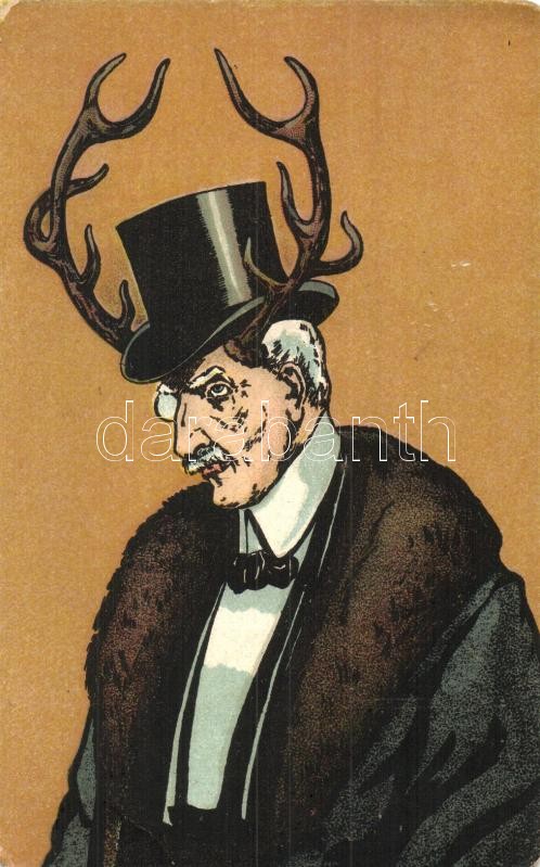 Leírás: Man with antler, humour, litho, "Nagykárolyi Protestáns Társaskör" So. Stpl. (fa)