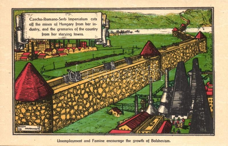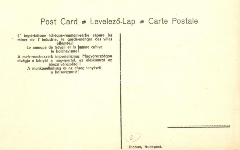 A cseh-román-szerb imperializmus Magyarországon elvágja a bányát a nagyipartól, az éléskamrát az éhező városoktól! A munkanélküliség és az éhség tenyészti a bolsevizmust! / Anti-Czecho-Romano-Serb Bolshevism propaganda card. Unemployment and Famine encourage the growth of Bolshevism. Hungarian irredenta s: Eugen Haranghy