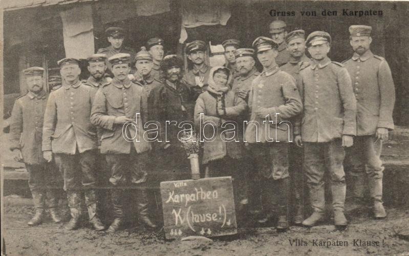 1915 Villa Karpathen Klause! Gruss von den Karpaten! / WWI K.u.K. military, soldiers' group photo with Carpathian villagers + K.u.K. Etappentrainzug des Korps F.M.L. Hofmann