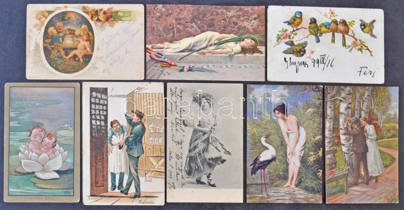 Leírás: 74 db RÉGI motívumos képeslap; üdvözlőlapok, hölgyek, vallás, közte több litho / 74 pre-1945 motive postcards; greetings, ladies, religious, with lithos