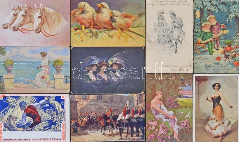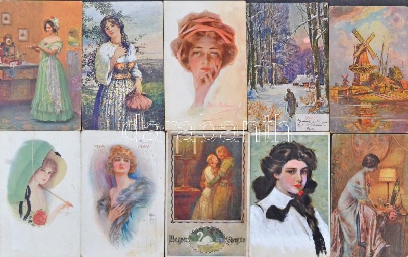 Szép művészeti képeslap gyűjtemény hagyatékból, több mint 500 db zömmel a 10-es 20-as évekből, közte kevés egyéb motívum és üdvözlőlap, dobozban. / About 500 mostly art, thematic, greeting postcards in a box