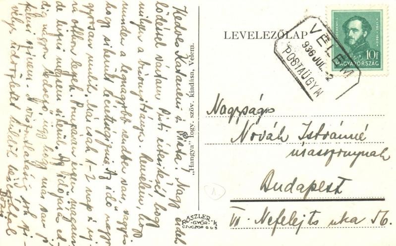 Leírás: 1936 Velem, utca + Postaügynökségi pecsét a hátoldalon