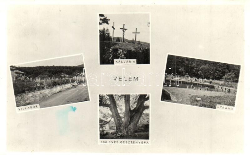1942 Velem, villasor, Kálvária, 600 éves gesztenyefa, strand https://www.darabanth.com/hu/327-Gyorsarveres/327.0/Kepeslapok/Magyarorszag~1000006/1942-Velem-villasor-Kalvaria-600-eves-gesztenyefa-strand~II1824046