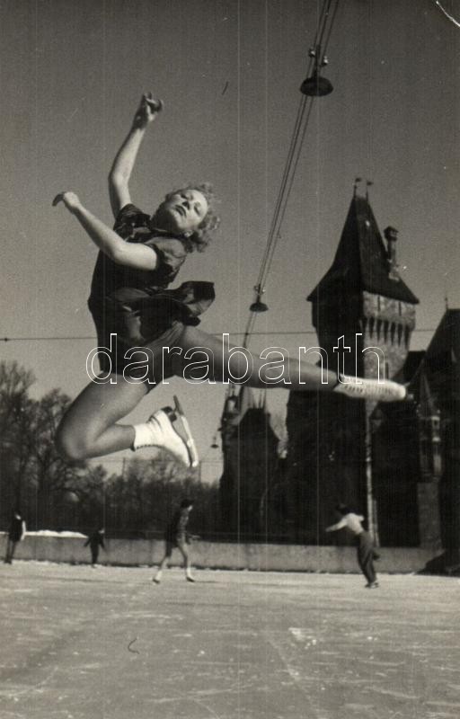 1955 Budapest XIV. Városligeti Műjég, Mesterházi Nagy Márta műkorcsolyázó. Bojár Sándor eredeti fényképe "1955 Európa Műkorcsolya Bajnokság" So. Stpl (EK)