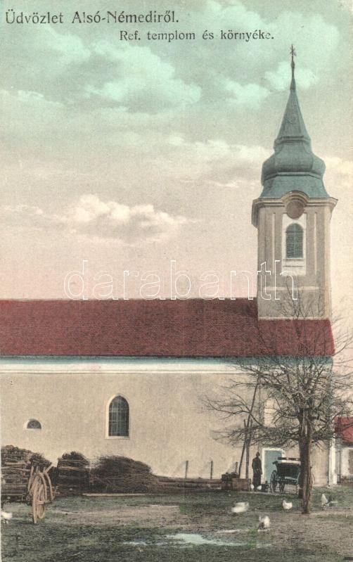 Leírás: Alsónémedi, Református templom és környéke, szekér, gémeskút. Reinkopf János kiadása (EK)