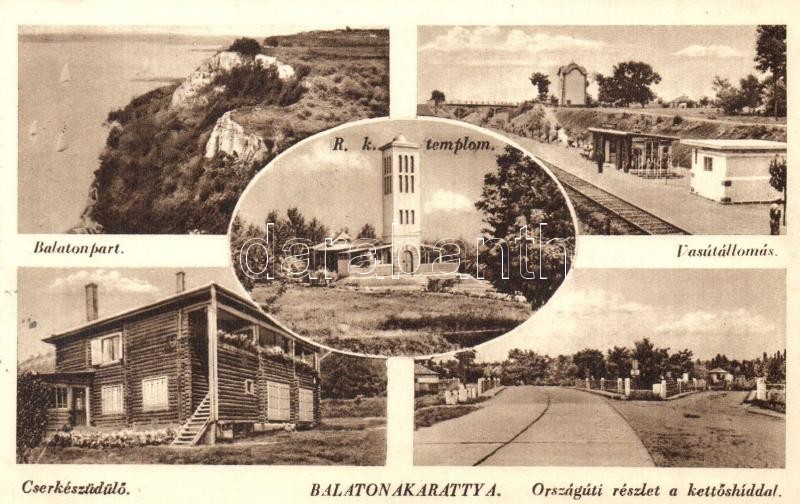 Leírás: Balatonakarattya, Balaton part, Vasútállomás, Római katolikus templom, Cserkész üdülő, Országúti részlet a kettős híddal