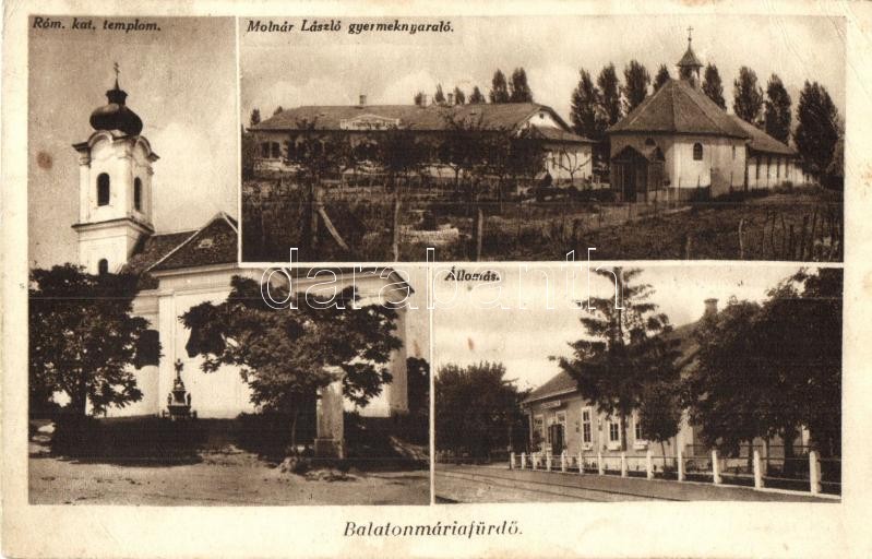 Leírás: Balatonmáriafürdő, Vasútállomás, Római katolikus templom, Molnár László gyermeknyaraló (EB)