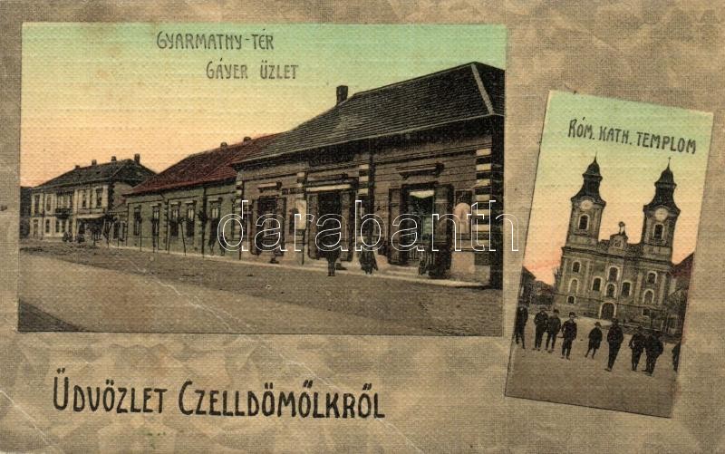 Leírás: Celldömölk, Római katolikus templom, Gyarmathy tér, Gáyer Gyula üzlete és saját kiadása (EB)