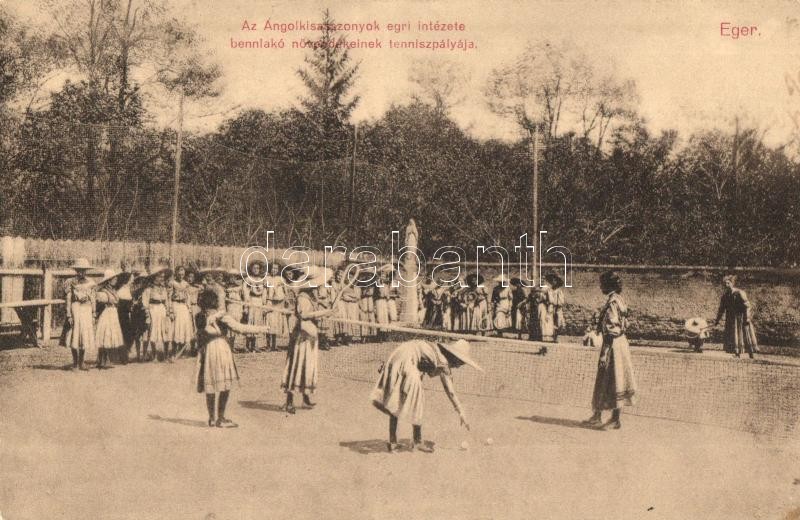 Leírás: Eger, Angol kisasszonyok intézete, bennlakó növendék teniszpályája, lányok meccs közben