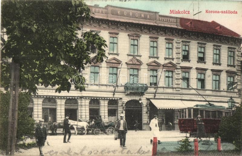 Miskolc, Korona szálloda, villamos, hintó https://www.darabanth.com/hu/327-Gyorsarveres/327.0/Kepeslapok/Magyarorszag~1000006/Miskolc-Korona-szalloda-villamos-hinto~II1824927