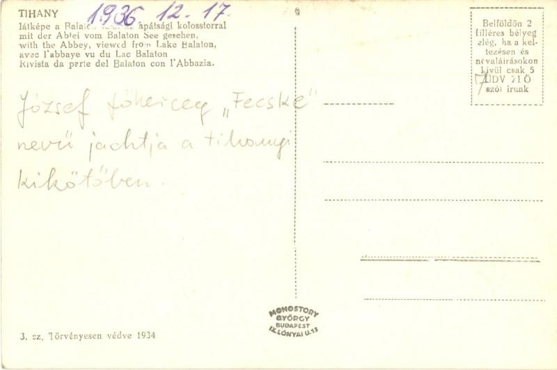 Tihany, Apátság, József főherceg "Fecske" nevű jachtja a kik... https://www.darabanth.com/hu/327-Gyorsarveres/327.0/Kepeslapok/Magyarorszag~1000006/Tihany-Apatsag-Jozsef-foherceg-Fecske-nevu-jachtja-a-kikotoben~II1824637