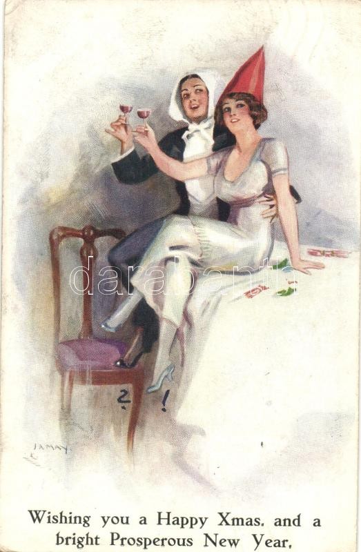 Leírás: 'Wishing you a Happy Xmas and a bright Prosperous New Year' /Celebrating couple The Carlton Publisher Co. Series No. 640, artist signed