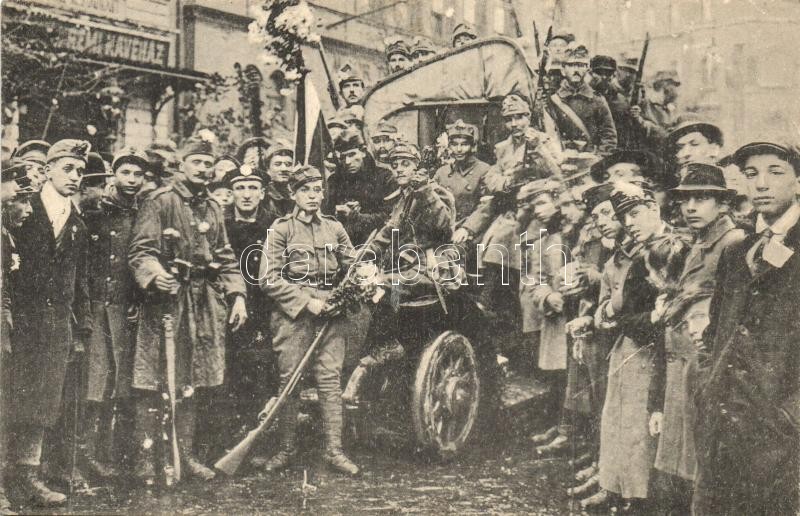 1918 Budapest, Rémi Kávéház, Az Őszirózsás forradalom emlékére, őszirózsás katonák csoportképe / Soldiers wearing aster flowers and new cap buttons during the Aster Revolution