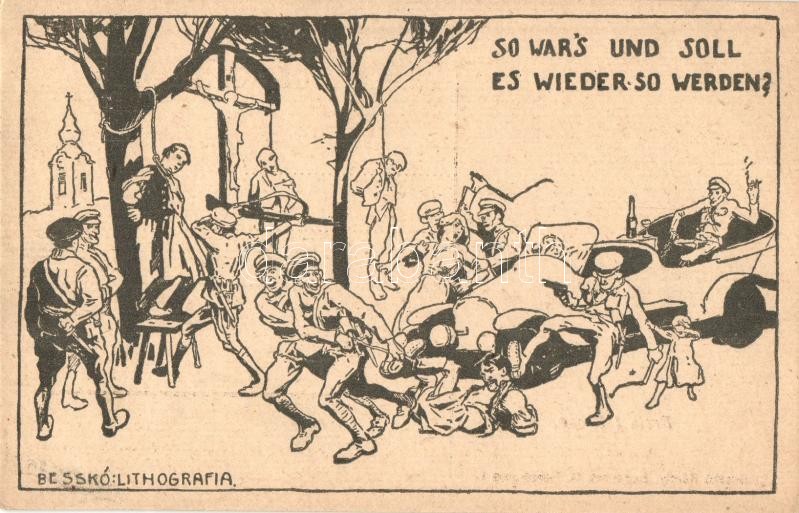 Tanácsköztársaság és kommunizmus ellenes propaganda lap, Besskó Károly kiadása / So war's und soll es wieder so werden? / Hungarian anti-communist propaganda art postcard