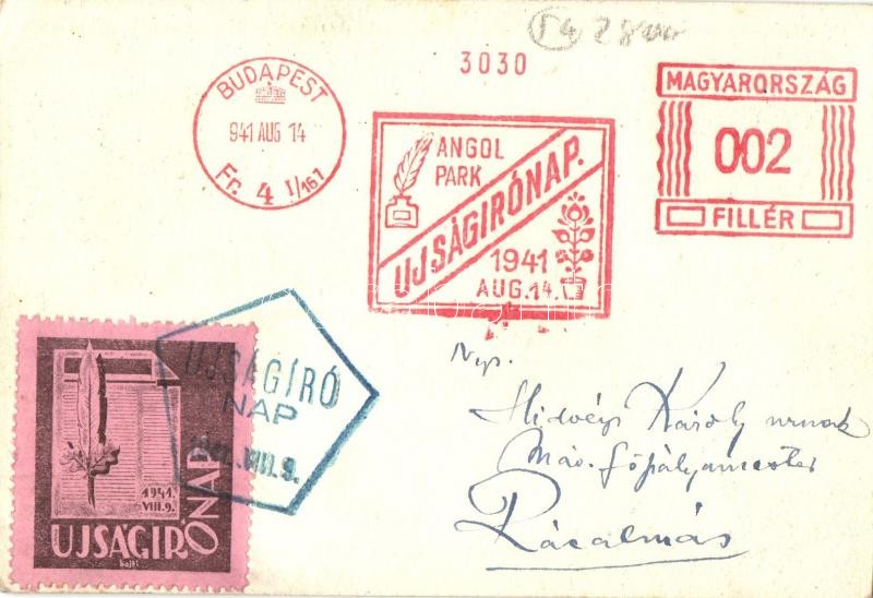 1941 Újságírónap / Hungarian journalist day, 'Újságírónap' S... https://www.darabanth.com/hu/327-Gyorsarveres/327.0/Kepeslapok/Reklam~1000073/1941-Ujsagironap-Hungarian-journalist-day-Ujsagironap-So-Stpl-non-PC-s-Mallasz-Git~II1822803