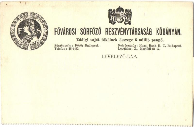 Budapest X. Kőbánya, Fővárosi Sörfőző Rt. reklám levelezőlapja / Hunga... https://www.darabanth.com/hu/327-Gyorsarveres/327.0/Kepeslapok/Reklam~1000073/Budapest-X-Kobanya-Fovarosi-Sorfozo-Rt-reklam-levelezolapja-Hungarian-beer-advertiseme~II1822807