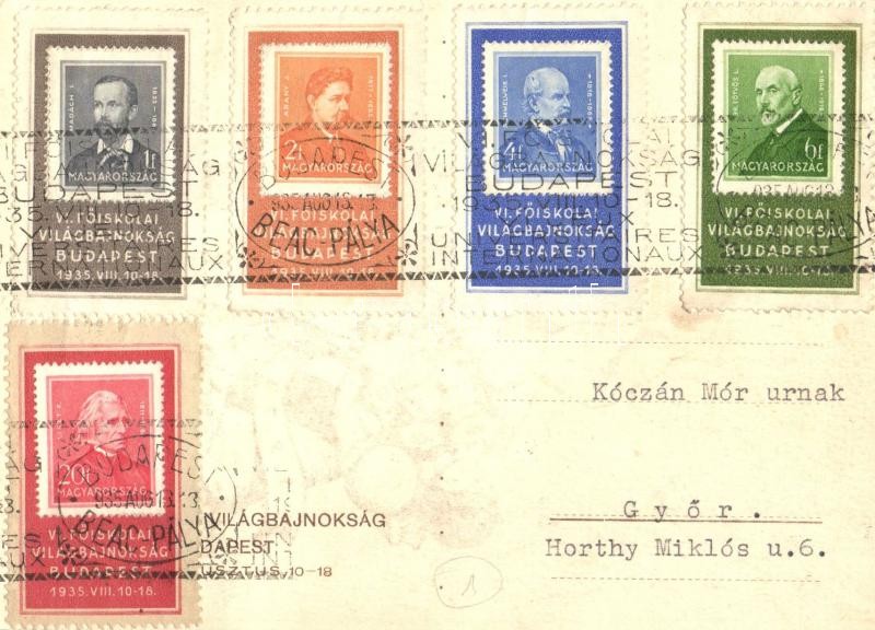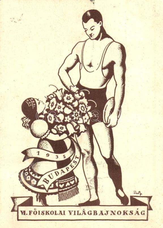 1935 Budapest, VI. Főiskolai Világbajnokság, szignós grafikai lap. Hátoldalon bélyegzések / 6th College World Championship in Athletics, artist signed, So. Stpl