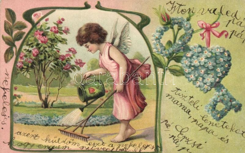 Leírás: Angel watering the flowers, greeting postcard, Emb. litho