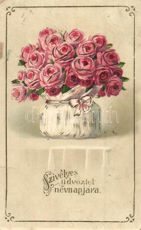 Leírás: 'Szívélyes üdvözlet névnapjára' / Nameday greeting postcard, roses, litho (kopott sarkak / worn corners)