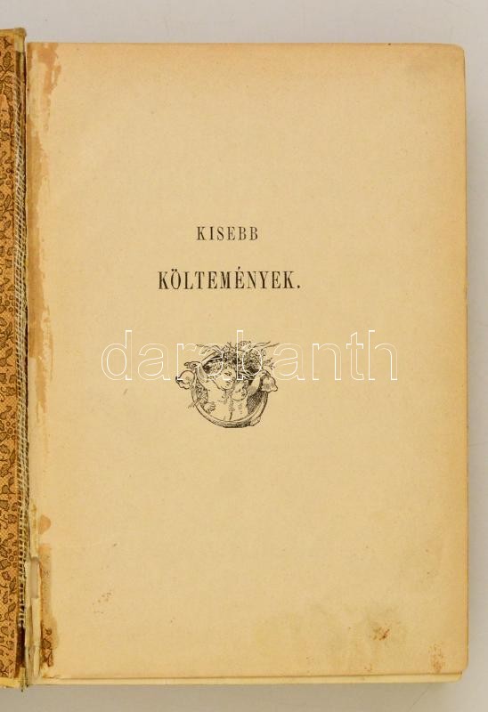 Arany János kisebb költemények. Bp.,1891, Ráth Mór. Kilencedik kiadás. Kiadói dúsan aranyozott, festett egészvászon-kötés, aranyozott lapélekkel, rossz állapotban, sérült kötéssel, a hátsó kötéstábla lejár, a gerince kissé sérült, a borító kissé kopott, kissé foltos, 3 kijáró lappal.
