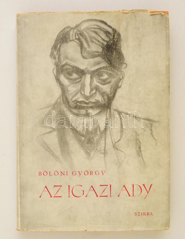 Bölöni György: Az igazi Ady. A borító illusztrációja Pór Bertalan munkája. A párizsi fotókat André Kertész készítette. A Magyar Könyvnapokra készült kiadvány. Bp.,1947, Szikra, 403 p.+24 t.(Kétoldalas fekete-fehér fotók.) Második kiadás. Kiadói illusztrált papírkötés, a borító szélein kis szakadásokkal.