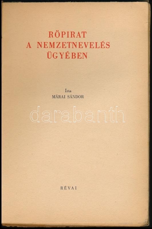 Márai Sándor: Röpirat a nemzetnevelés ügyében. Bp.,1942, Révai. Kiadói... https://www.darabanth.com/hu/327-Gyorsarveres/327.0/Konyvek/Konyvek-Egyeb-ritkasagok~2500019/Marai-Sandor-Ropirat-a-nemzetneveles-ugyeben-Bp-1942-Revai-Kiadoi-papirkotes-javit~II1821440