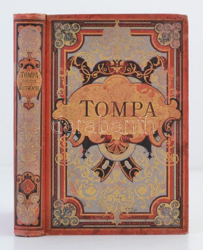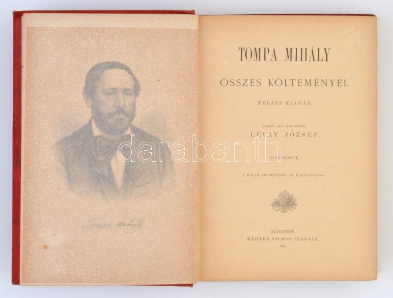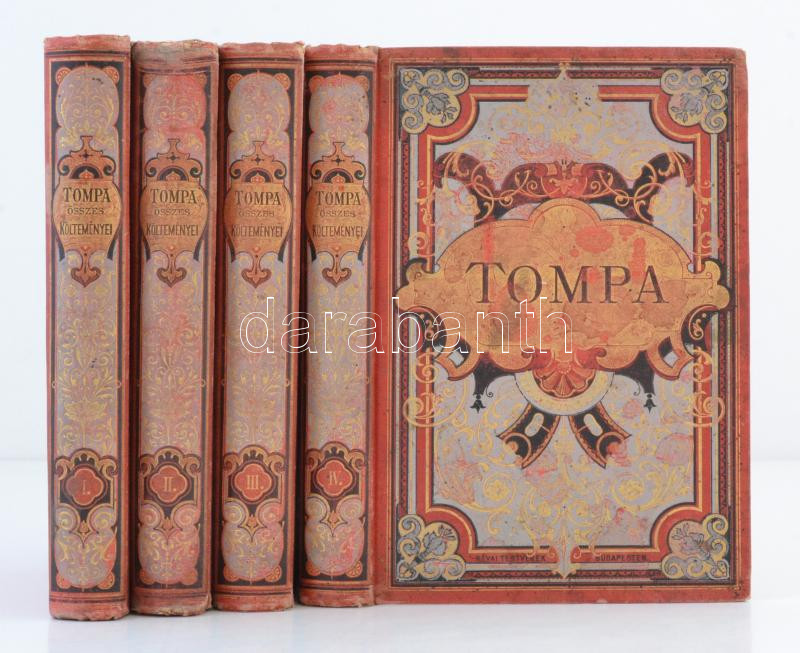 Tompa Mihály összes költeményei I-IV. kötet. Sajtó alá rend. Lévay József. Rendezték barátai Arany János, Gyulai Pál, Lévay József és Szász Károly. Tompa Mihály életrajzát írta Szász Károly. Budapest , 1885, Méhner Vilmos, 1 t. címkép+XXXIX+379+III p.+451 p.+438p.+386p. Kiadói, festett, aranyozott egészvászon kötésben, aranyozott lapszélekkel. Kicsit kopott, kicsit foltos borítóval, kissé viseltes gerinccel, a I. kötet hátsó védőlapja tollal firkált, a III. kötet elülső előzéklapja szakadt. Teljes kiadás.
