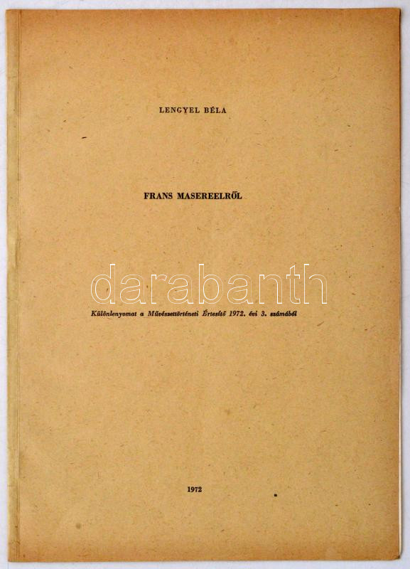 Leírás: Lengyel Béla: Frans Masereelről. Budapest, 1972, Művészettörténeti Értesítő, 206-212 p. Papírkötés.