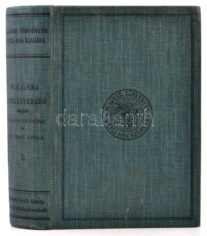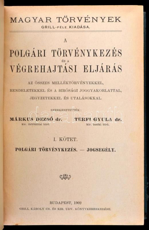 A polgári törvénykezés és a végrehajtási eljárás. I. kötet: Polgári törvénykezés-jogsegély. Szerk.: Dr. Márkus Dezső, Dr. Térfi Gyula. Magyar Törvények Grill-féle kiadása. Bp.,1902, Grill Károly. Kiadói egészvászon-kötés, Gottermayer Nándor-kötés, jó állapotban.