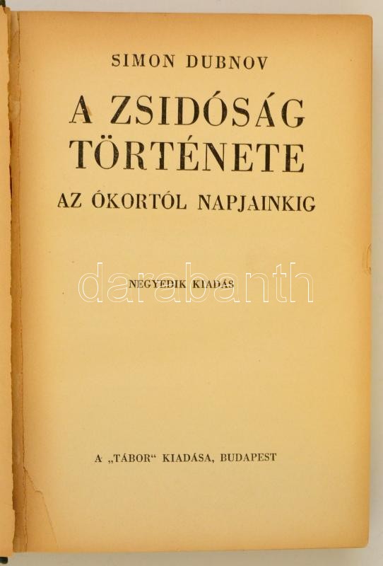 Simon Dubnov: A zsidóság története az ókortól napjainkig. Ford.: Dr. Szabolcsi Bence. Bp., [1942], Tábor. Negyedik kiadás. Kiadói egészvászon-kötés. Egyik szennylap kijár.