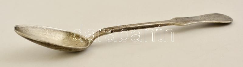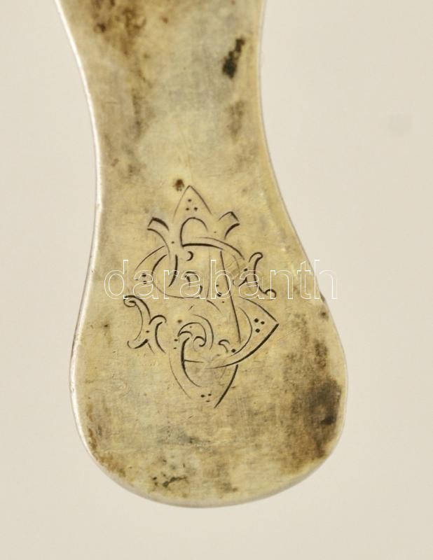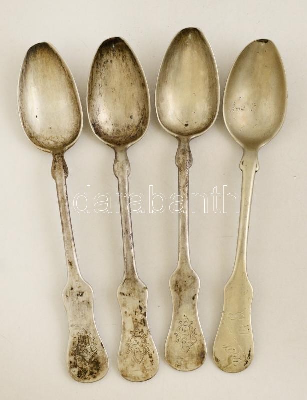 Leírás: Ezüst (Ag.) monogramos kanál (4 db), jelzett, mesterjeggyel, h:15,5 cm (4×), foltos, nettó:118 g