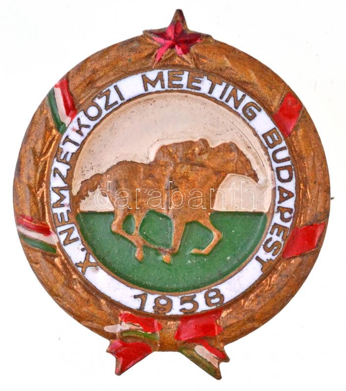 1958. "X. Nemzetközi Meeting Budapest 1958" festett fém jelv... https://www.darabanth.com/hu/327-Gyorsarveres/327.0/Numizmatika/Falerisztika-Kituntetesek-jelvenyek~2000017/1958-X-Nemzetkozi-Meeting-Budapest-1958-festett-fem-jelveny-kis-disztokban-23mm-T2~II1821028