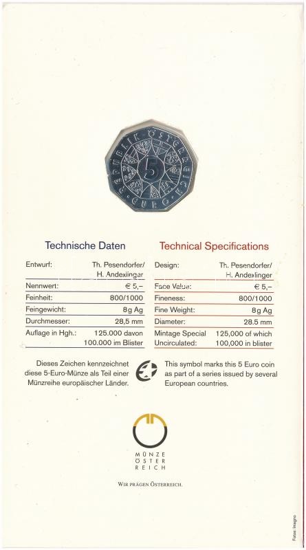 Austria 2006. 5 Euros Ag "Mozart" on cardboard sheet C:UNC