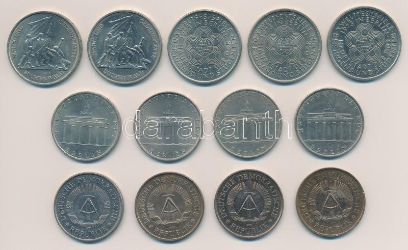 Leírás: NDK 1969. 5M Ni-Br "20. éves a Népi Demokratikus Köztársaság" (4x) + 1971. 5M Ni-Br "Brandenburgi kapu" (4x) + 1972. 10M Ni-Br "Buchenwald Emlékmű" (2x) + 1973. 10M Ni-Br "10. Ifjúsági Fesztivál Játékok" (3x) T:1-,2