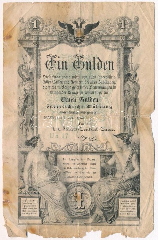 Austrian Empire 1866. 1 G... https://www.darabanth.com/hu/327-Gyorsarveres/327.0/Numizmatika/Magyar-bankjegyek~2000007/1866-1G-STN-vizjeles-TIII-IV-Austrian-Empire-1866-1-Gulden-STN-watermark-CVG-G-Adamo-G97~II1818332