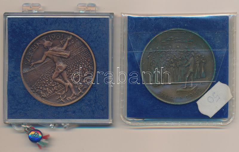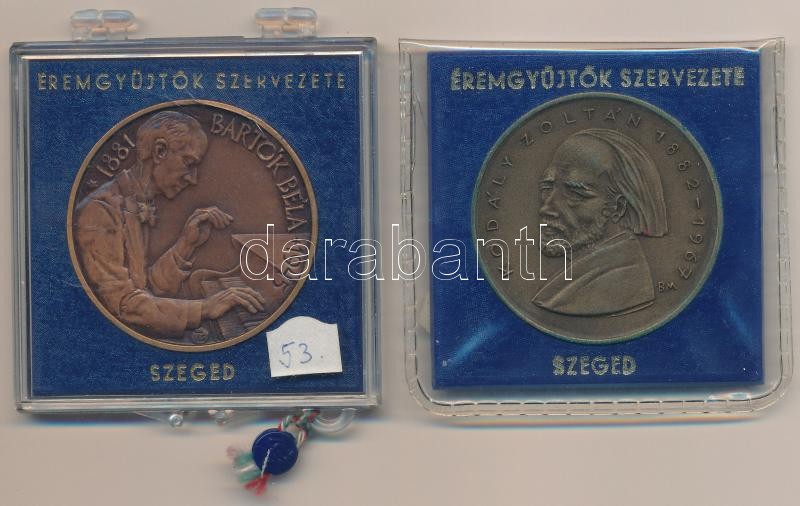 Leírás: Tóth Sándor (1933-) 1981. "MÉE Szeged / Bartók Béla" Br emlékérem (42,5mm) + Borsos Miklós (1906-1990) 1982. "MÉE Szeged - Kodály Zoltán 1882-1967" Br emlékérem (42,5mm) T:1-,2 patina
