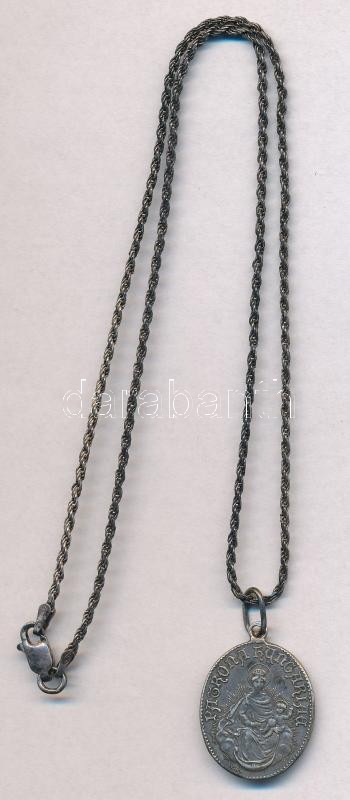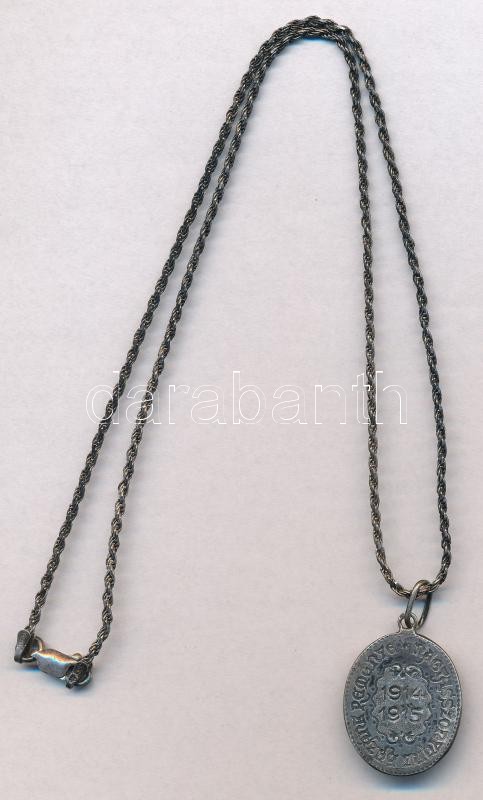 Leírás: 1915. "Hazánk reménye Nagyasszonyuk 1914-1915 / Patrona Hungarie" patrióta medál láncon, medál fémjel nélkül, lánc jelzett Ag (7,80g/0.925) T:2