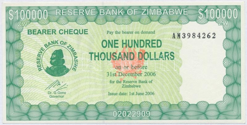 Zimbabwe 2006. 100.000$ "Reserve Bank of Zimbabwe" bemutatóra szóló csekk T:I-