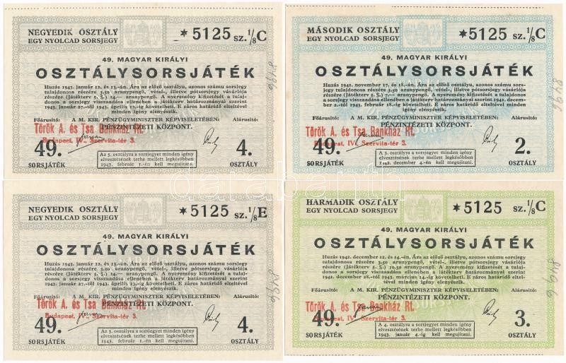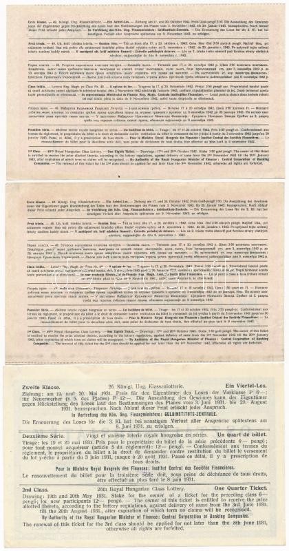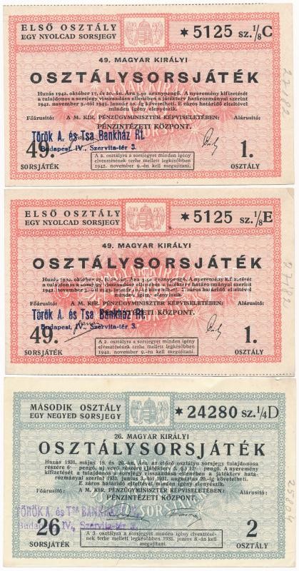 1931. "26. Magyar Királyi Osztálysorsjáték" második osztály egy negyed "D" sorsjegye + 1942. "49. Magyar Királyi Osztálysorsjáték" első osztály egy nyolcad "C" és "E" sorsjegye + második osztály egy nyolcad sorsjegye + harmadik osztály egy nyolcad sorsjegye + negyedik osztály egy nyolcad "C" és "E" sorsjegye. Mind a 7db bélyegzéssel T:I-,II