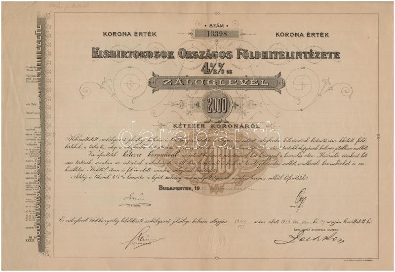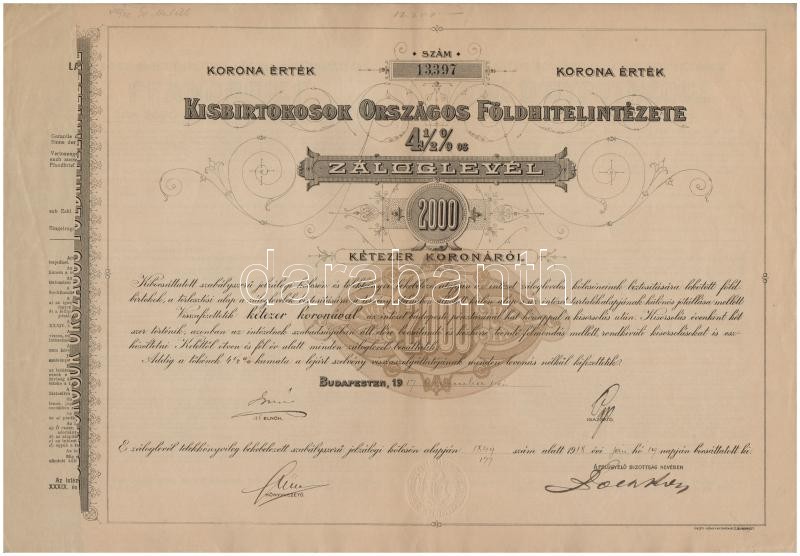 Budapest 1917. "Kisbirtokosok Országos Földhitelintézete" 4 1/2%-os záloglevele 2000K-ról, magyar, német és francia nyelven, szárazpecséttel (2x) sorszámkövetők T:III