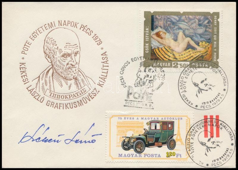 Leírás: Kékesi László (1919-1993): bélyegtervező, grafikus aláírása alkalmi bélyegzéssel ellátott borítékon